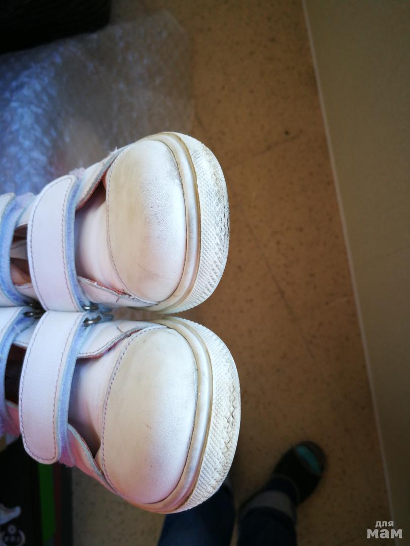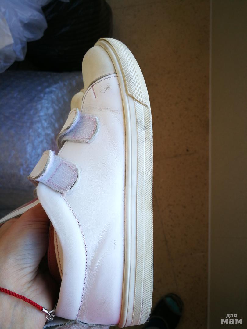 Следы носки на резиновой подошве. Она белая, а площадка у нас во дворе с черным покрытием. И гадость эта не смывается. Розовая кожа без повреждений.