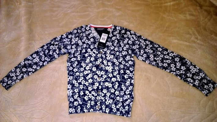 Невероятно мягкая и стильная кофточка с эффектным принтом. Из очень мягкого хлопка. Вырез под горло с вязаными полосками вдоль горловины, фирменные металлические пуговицы на планке. Воротник, манжеты и нижняя кромка в рубчик. Флажок Tommy Hilfiger на груди.При стирке не скатывается, не садится, не линяет. состав: 100% хлопок