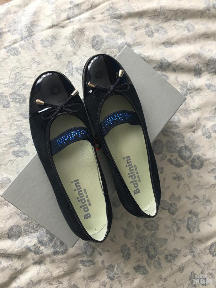 Новые, цвет чернильно-синий, мысок+пятка лак, остальное замша, очень удобные, можно для школы, по стельке 21,5см
