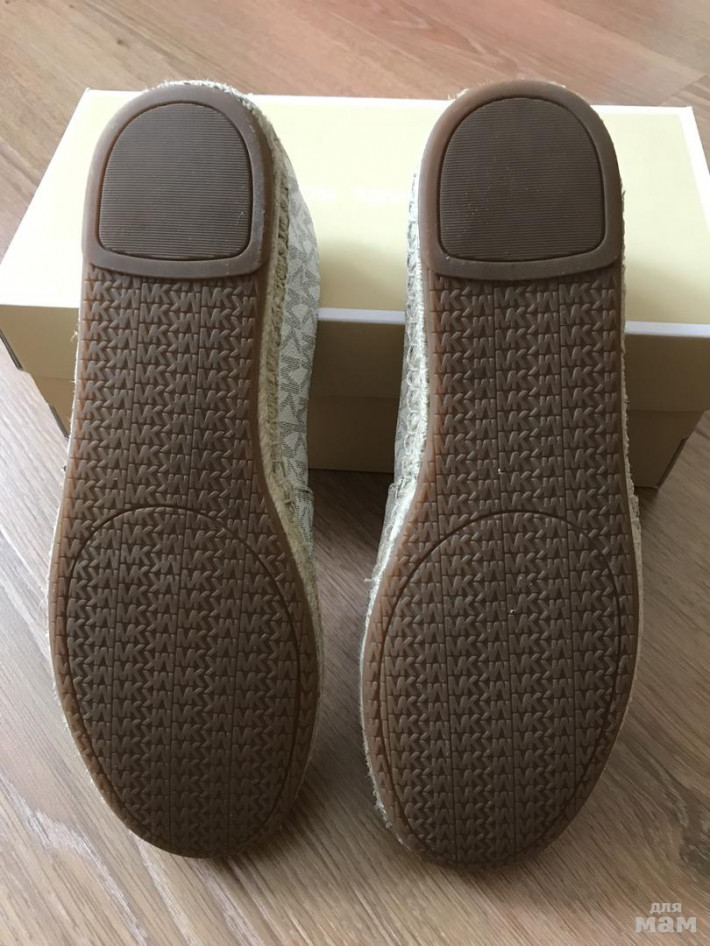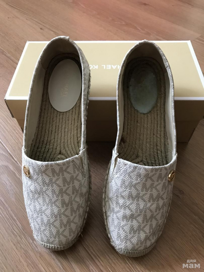 Классические белые эспадрильи украшены монограммой, составленной из инициалов Майкла Корса. Изделие на традиционной джутовой подошве с защитной резиновой накладкой сделаны из мягкой зернистой эко-кожи.