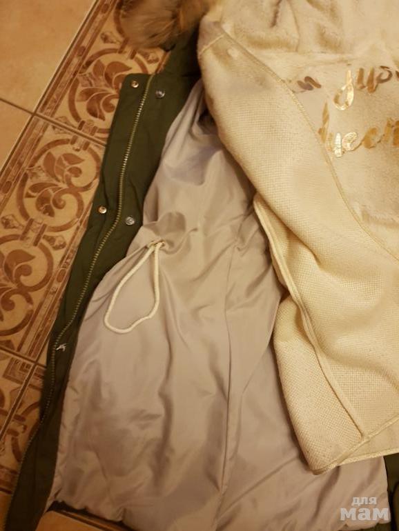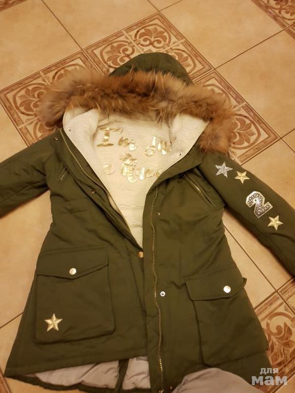 Состояние новой, с плюшевой подстежкой-кофтой с золотыми буквами, с ней можно носить в морозы, без нее парка на синтепоне-на прохладную осень.