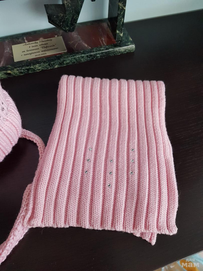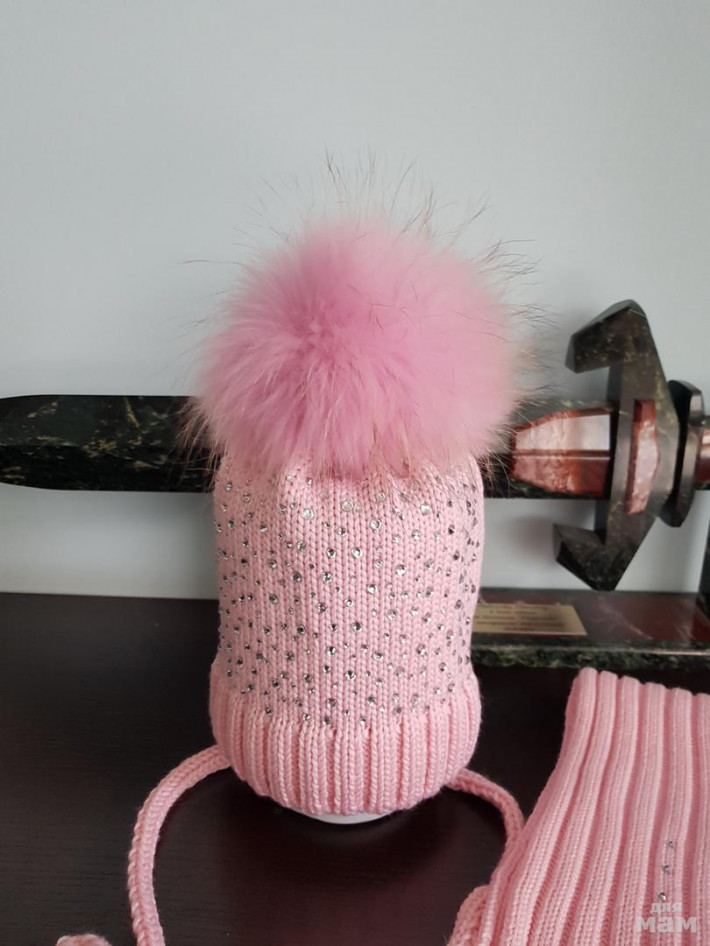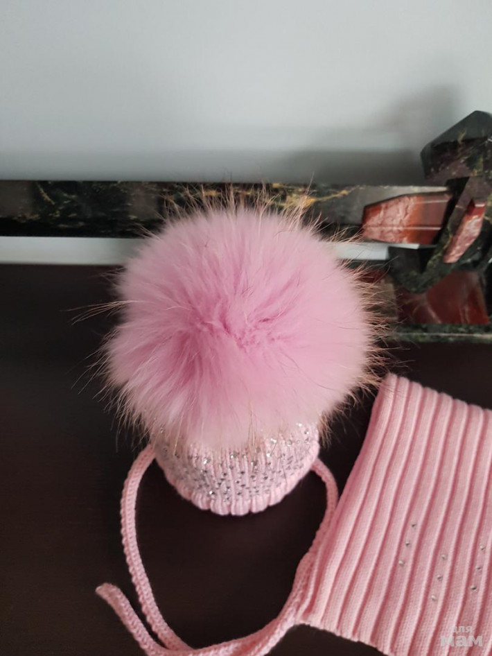 Шапочка новая. Машинная вязка. Вязал мастер из Екатеринбурга. Цвет розовый. Вязка одинарная, но очень плотная. 100% шерсть мериноса. Огромный помпон из енота (на фото немного примят). Шапочка украшена крупными стразами.