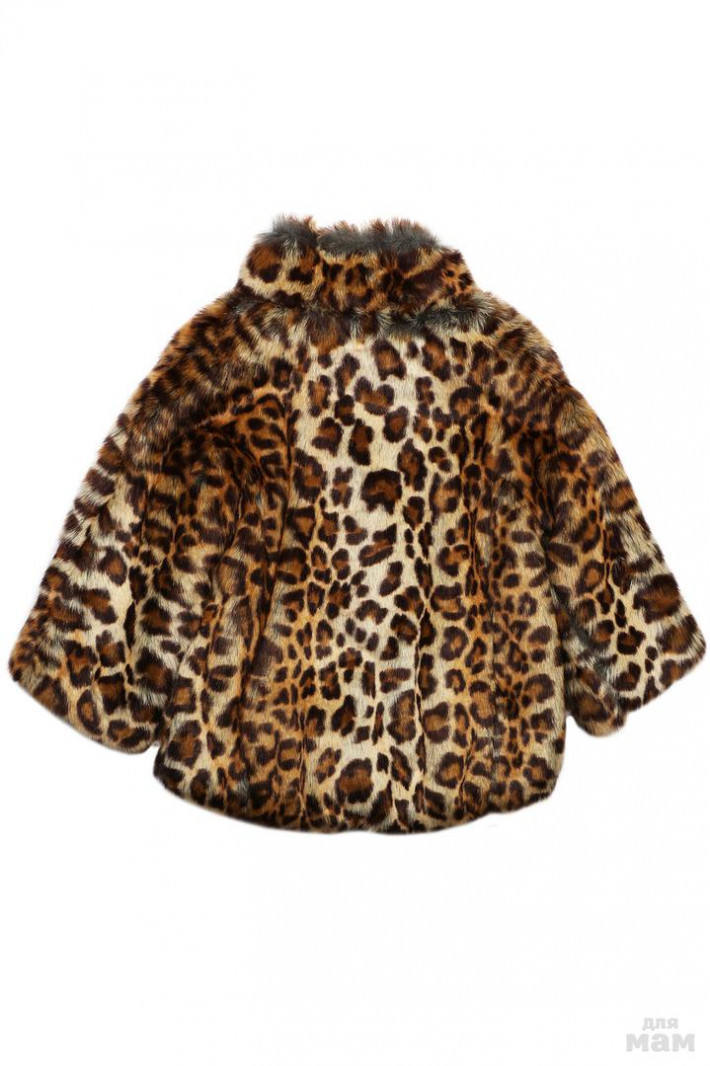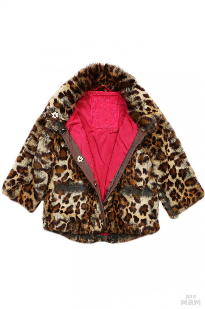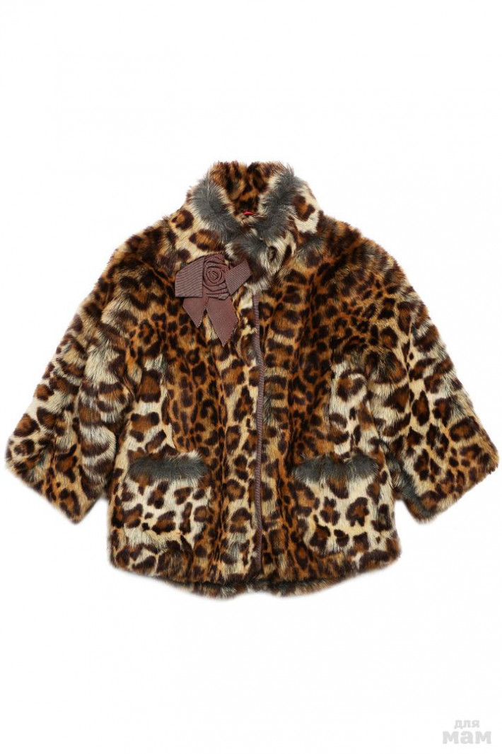 Укороченная шубка из искусственного меха свободного силуэта, с накладными карманами, воротником стойка и рукавами в три четверти. Застежка на кнопки расположена спереди. Воротник декорирован цветком из ленты.