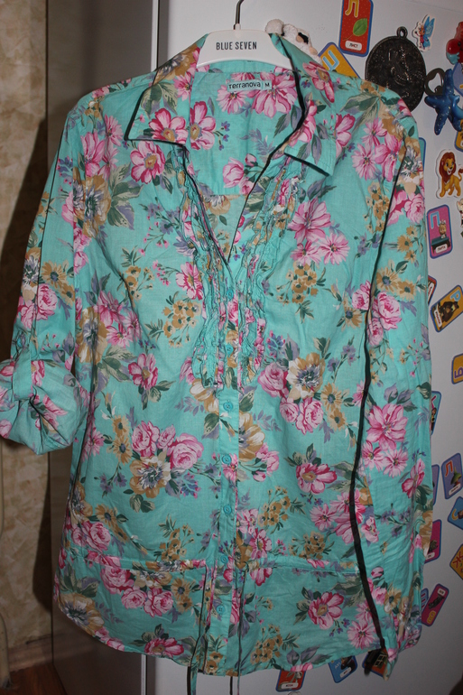 Яркая рубашка-туника, хлопок , можно подвернуть рукава, размер указан М, фирма Terranova, одета один раз, все таки мала ((( 350