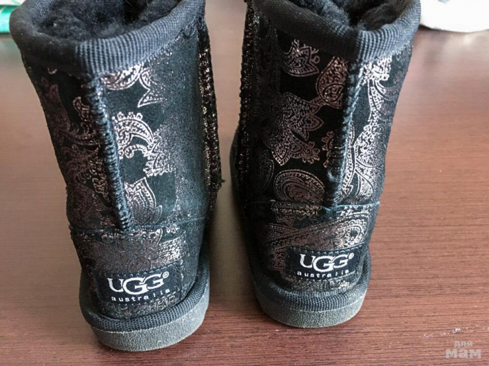 Очень теплые, полностью натуральные угги Ugg. В отличнейшем состоянии (даже мех не примят) Никаких нюансов нет, замша и рисунок не потерты. Носили в коляске и в помещении. Мех густой, плотный, поэтому стельку трудно замерить, но носили на размер 22-23