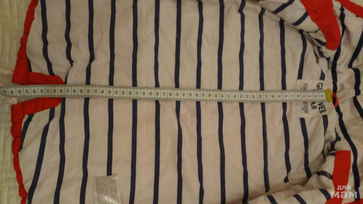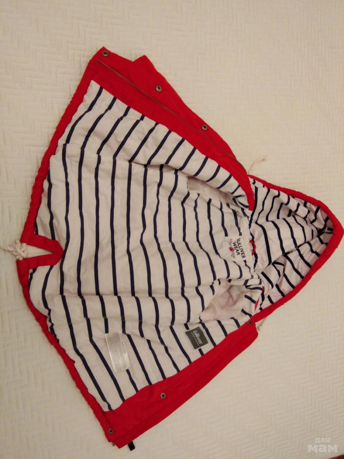 Снаружи плотная ткань не продуваемая. Внутри Хлопок. Целая, без пятен. Не маломерит. Цвет оранжевый. Внутри есть тонкий наполнитель. Межсезонье до +15. В морском стиле.
