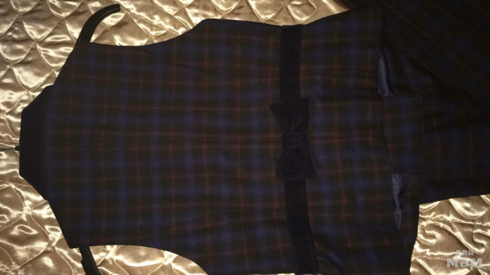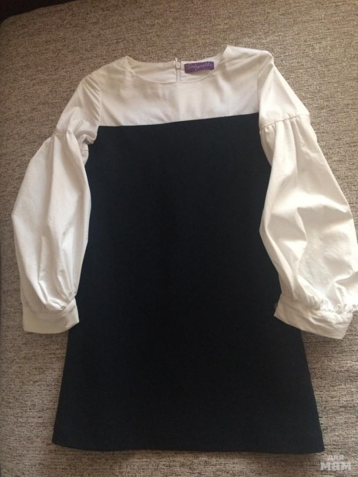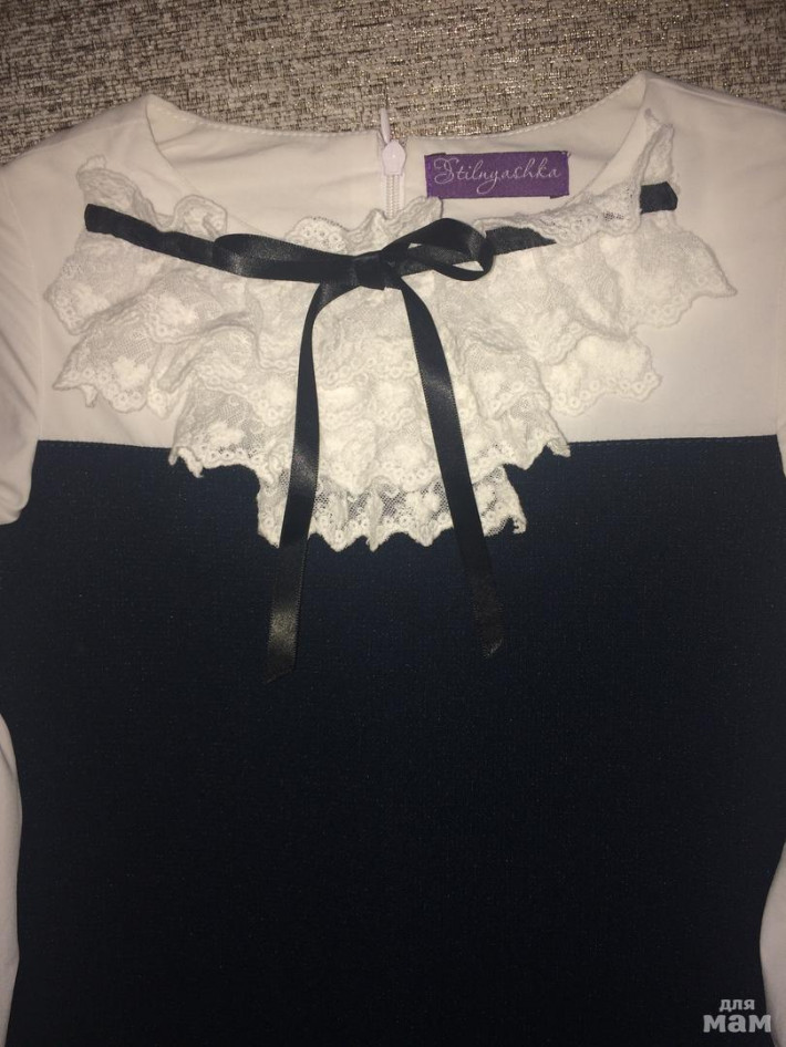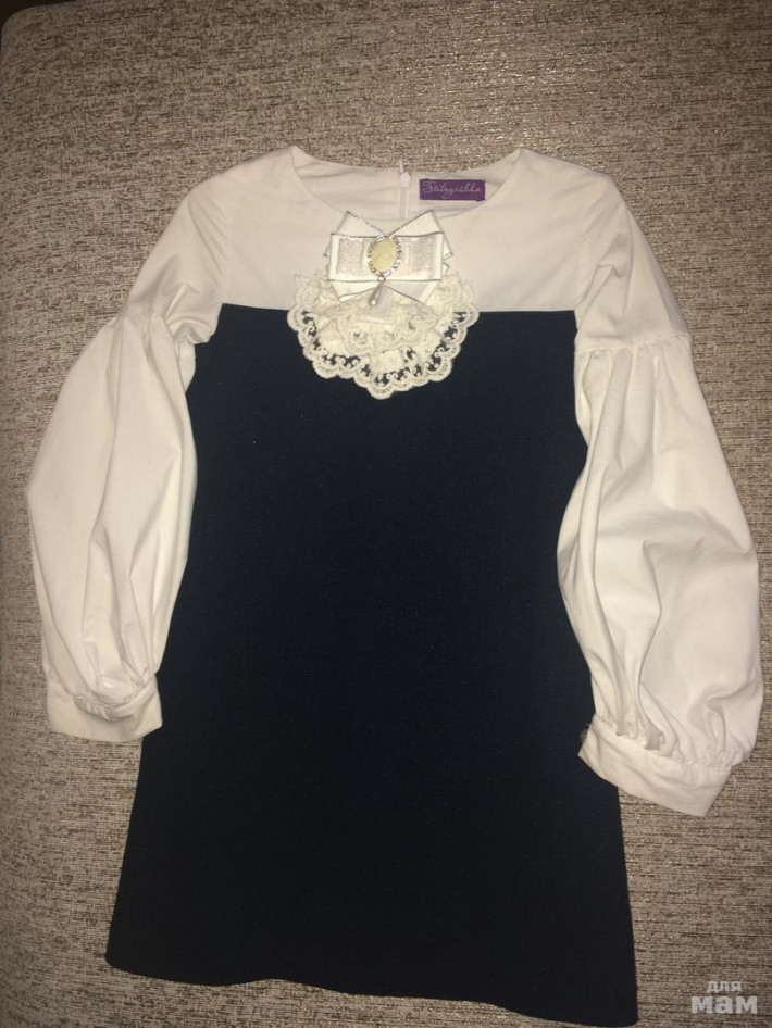 Платье размер 128, спереди на белом малозаметное желтоватое пятнышко, мы его маскировали съёмными жабо или галстуком( не продаются), под мышкой на рукаве след от шариковой ручки в носке совсем не заметен. Цена 350₽.