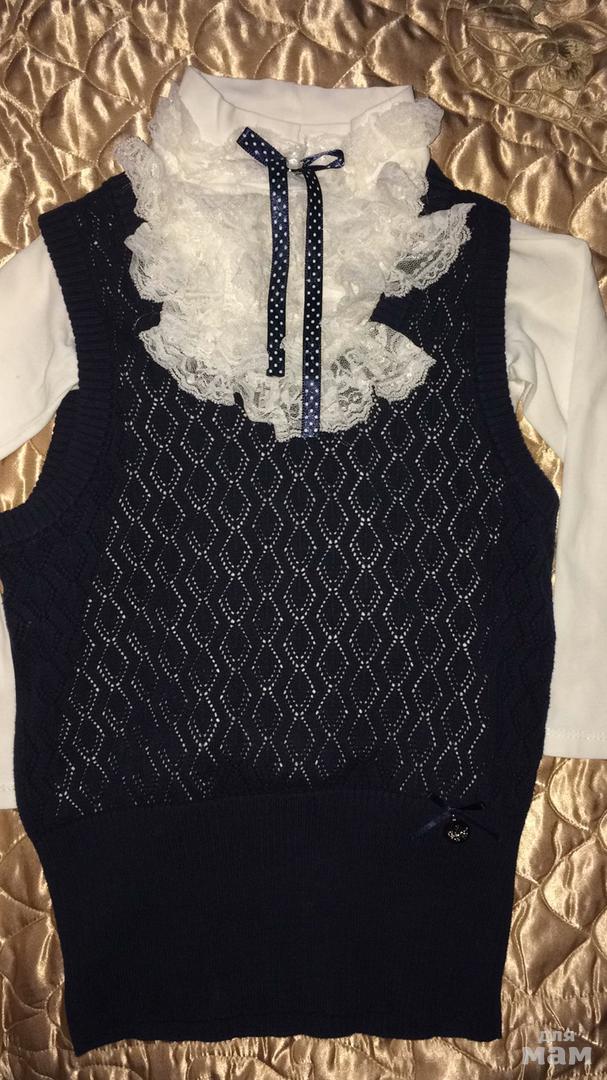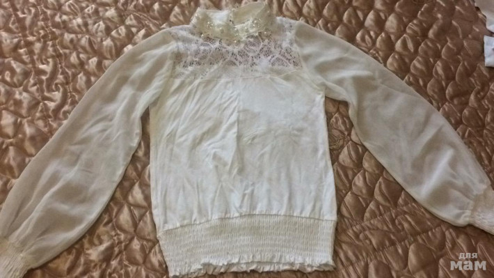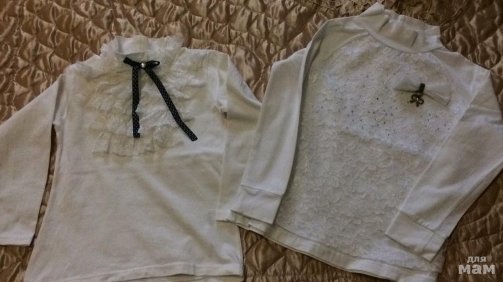 Блузка на рост 128-130, вискоза шифон, кружево по вороту бусинки и стразы, сзади пуговка. Цена за две водолазки, две блузки 500₽.