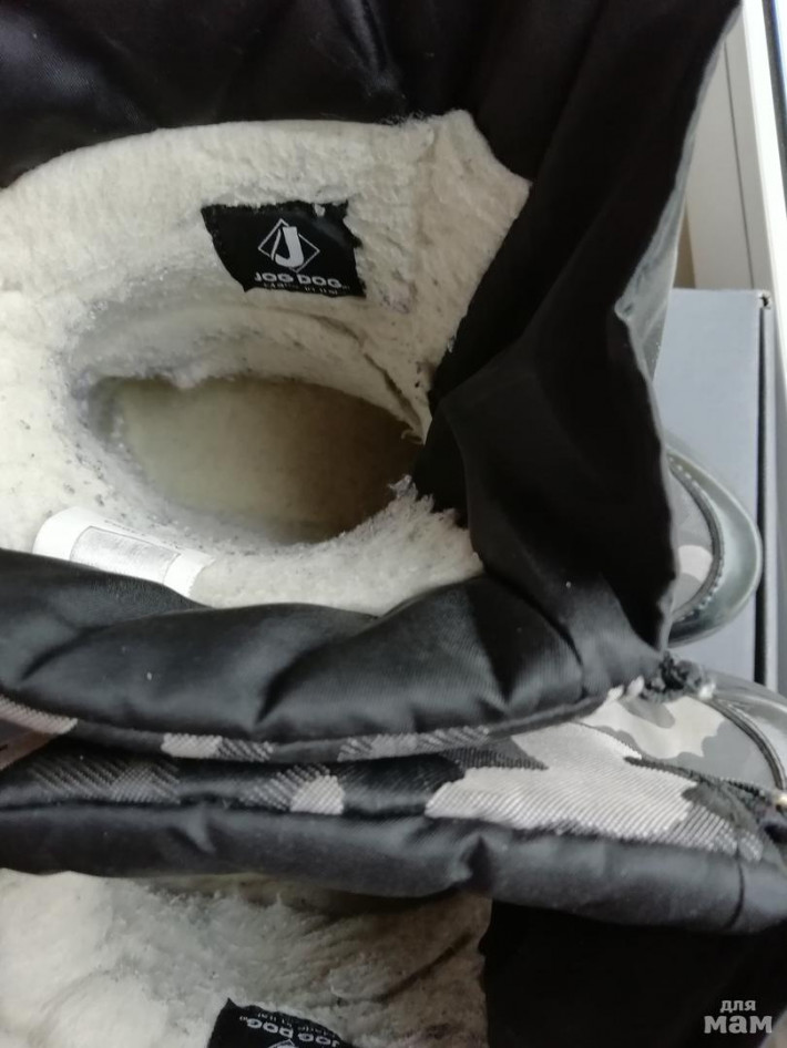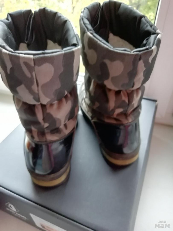 Теплые, очень модные сапоги для девочки. Принт камуфляж, лаковые канты. Подошва трактор, не скользит. Теплые и непромокаемые. На пяточках стерся мех, видно на фото. Стелька несъемная. Также есть потертости с внут. сторон на лаковых кантах.