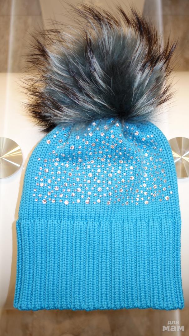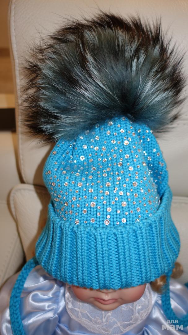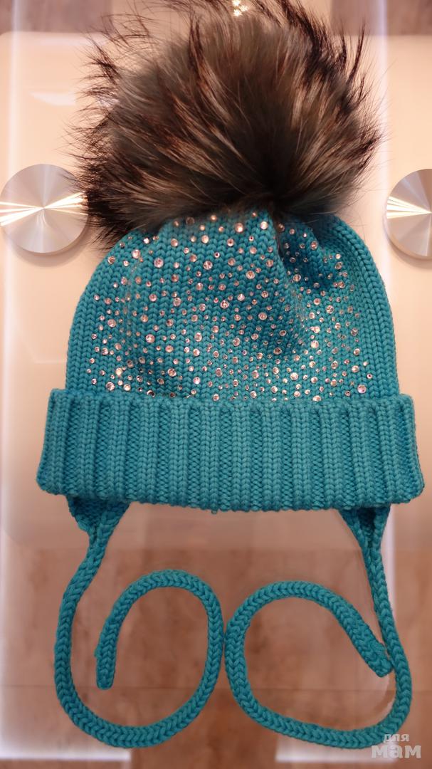 Шапка ОГ до 54 см примерно - полная глубина без подворота 23 см, ширина 21,5 см; хорошо тянется, с ушками, огромный помпон. Цвет бирюза, стразы все на месте. В идеальном состоянии, как новая.