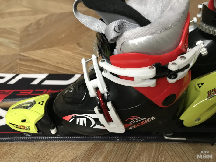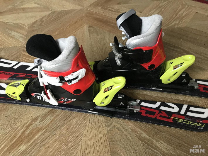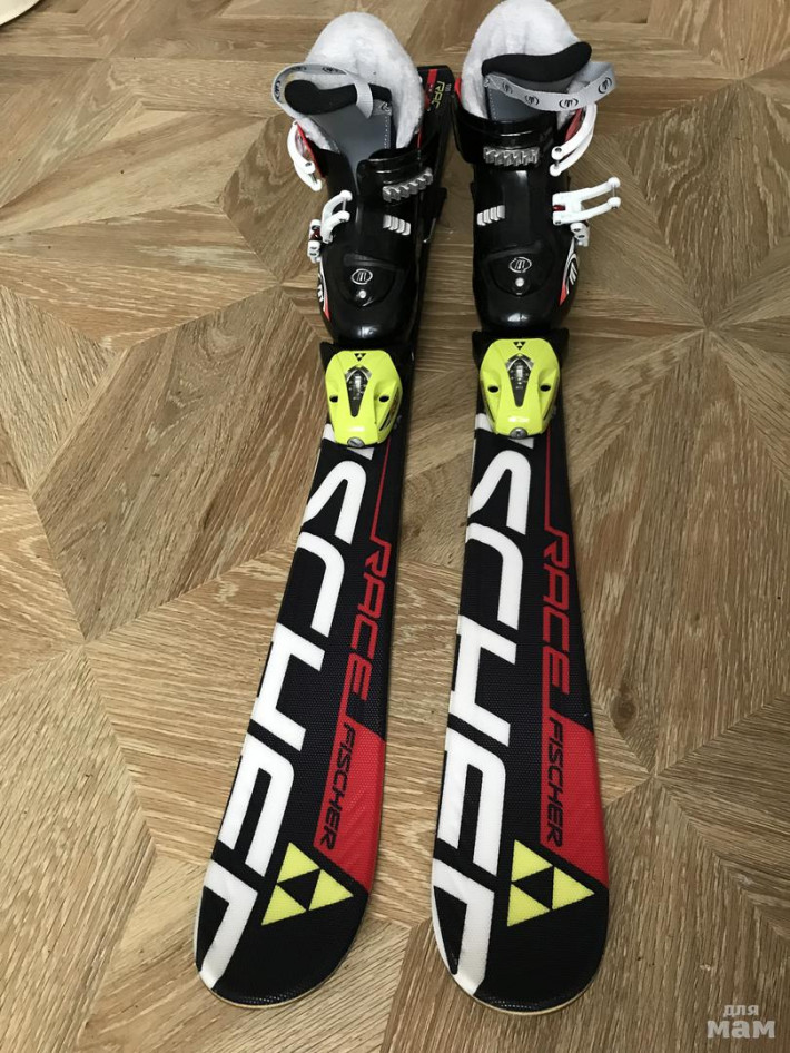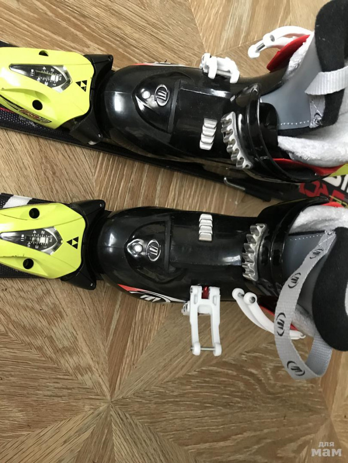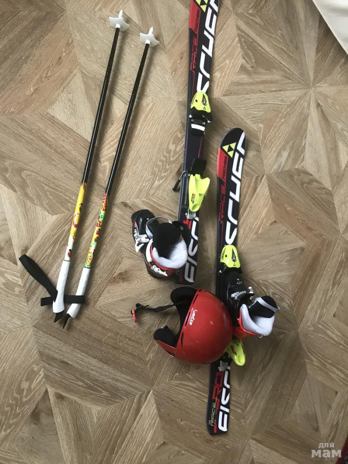 Ботинки на ножку 17-18 см, цена за комплект лыжи, палки, ботинки, шлем... б/у полраза)