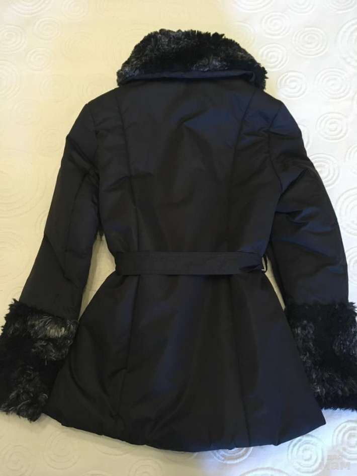 Чёрная утеплённая куртка европейского производства для девочки ростом 150см с искусственным мехом под каракуль на рукавах воротнике и бортике стильная аккуратная не пуховик, но тёплая на утеплителе