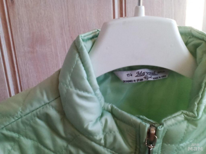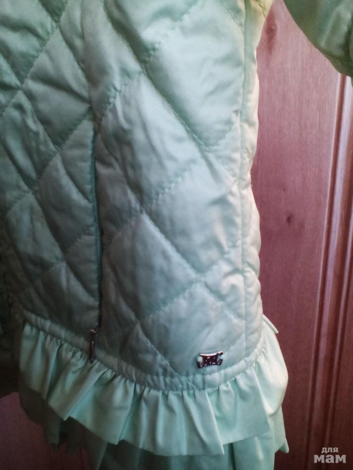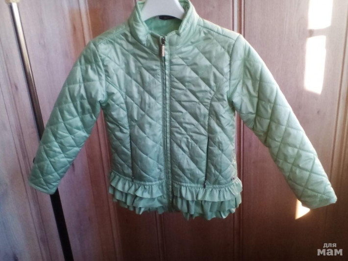 Шикарная лёгкая куртка Mayoral размер 4-104см. Испания. На тонком утеплителе, на теплую весну, холодное лето. Цвет светло зелёный, очень красивый, фото не передаёт (нежная мята/лайм). На молнии, два кармана на молнии, воротник стоечка, низ украшен рюшами, стеганная. Состояние отличное, б/у. Покупала в Болгарии в переводе на рубли за 3000 р.