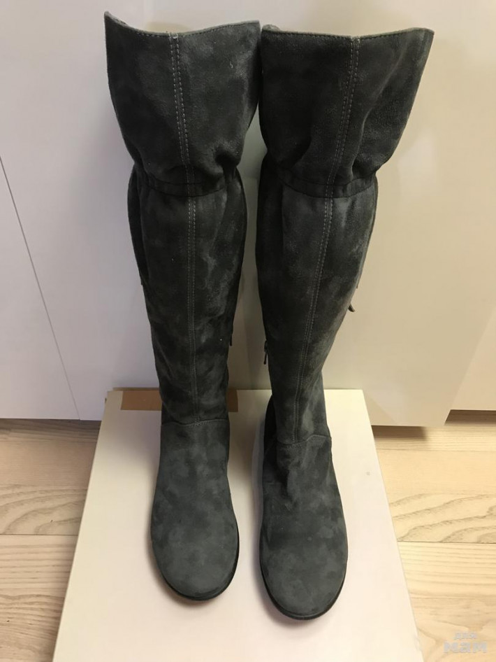 Сапоги ботфорты , сидят изумительно , нам к сожалению впритык , замша серая , сзади завязочки для Красоты , внутри кожа , можно взрослому , примерно по стельке 24-24,5