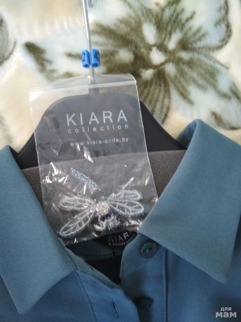 Платье женское, из костюмно-плательной ткани, длиной ниже линии колена; отрезное по линии талии с эластичной лентой по шву, с полуприлегающим лифом и расклешённой гофрированной юбкой; с отложным воротником и застежкой на петли и пуговицы; с длинным втачным рукавом со складкой по низу и застегивающейся манжетой. Платье украшено аппликацией «стрекоза» с бусинами в области нагрудного кармана из гипюра. Платье дополнено съемным завязывающимся поясом.