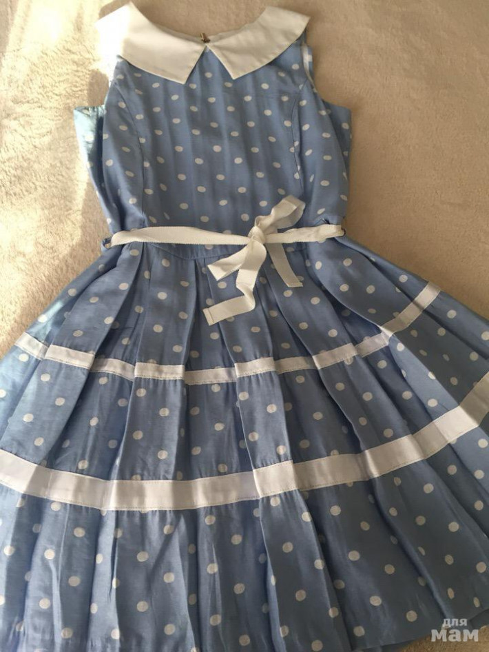 платье в горошек,надели один раз на праздник дня Победы(танцевали танец по песню синий платочек).Ткань с блеском,типа дикого шелка.Мы надевали с подъюбником.Состояние идеальное!Размер 8-10 лет,маркировка 140 рост.Цена платья была 28.000 руб