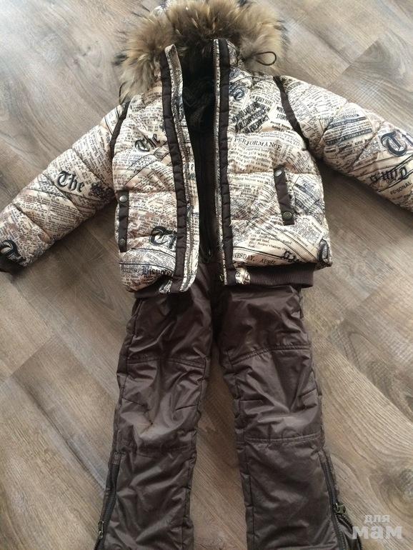 Очень теплая курточка Culliver "газета". Идет в размер с запасом, мех на капюшоне отстегивается, внутри флис, стирается отлично, не маркая, смотрится стильно. Цена курточки, полукомбез сносили), если надо отдам для горки)