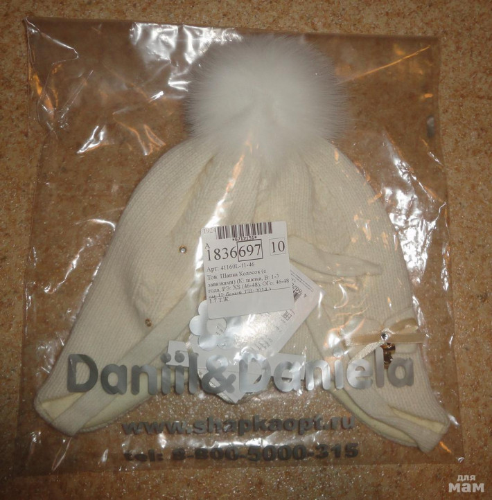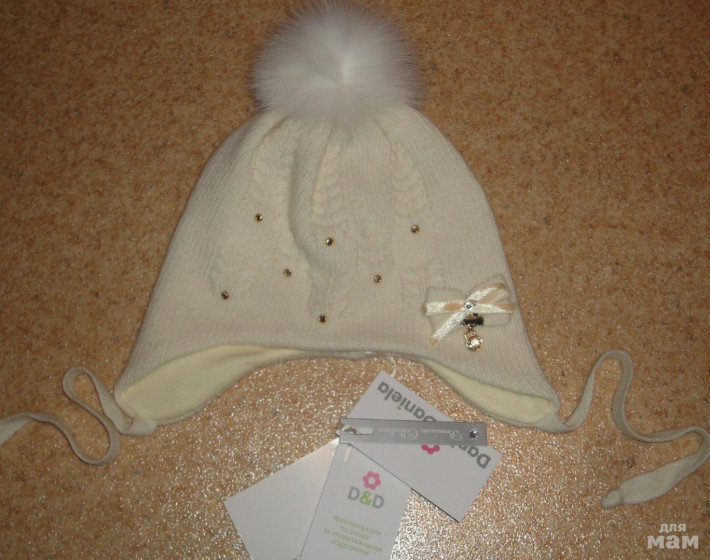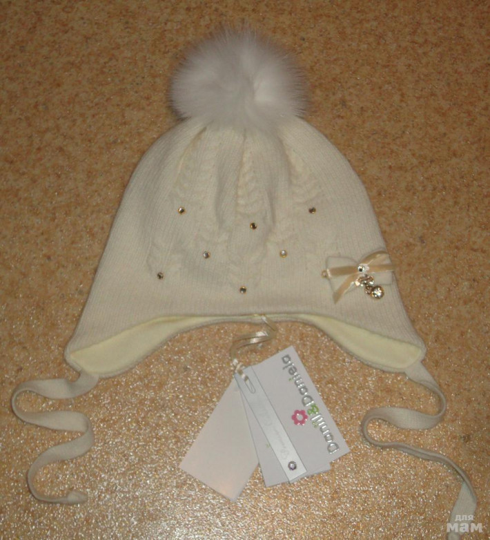 Абсолютно новая шапочка для девочки с вывязанными колосками, бантиком и помпоном из натурального меха песца белого цвета. На подкладке из вискозы. Марка Dan&Dani даниил и даниэлла Dan&Dani (Daniil&Daniela)