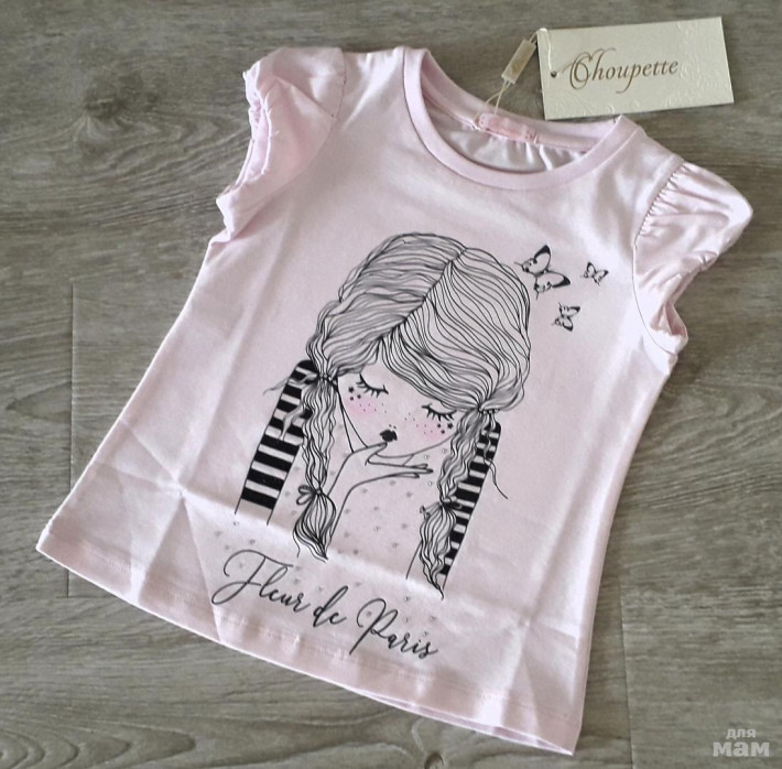 НОВАЯ Нежная футболочка CHOUPETTE р.104-110. Нежно-розового цвета с принтом девочка, украшена стразами. Рукавчик фонариком. Состав: хлопок 92%, эластан 8%. Мягкий шелковистый трикотаж, отлично тянется. Очень красивая 👧👧👧