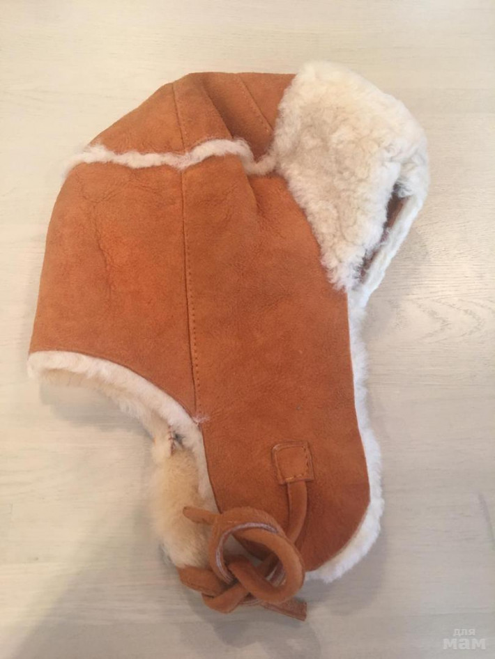 Коричневая шапка из ультрамягкой матовой кожи отделана внутри темной овчиной. Кожа натуральная плюс овчина 100%. Новенькая, очень теплая. ОГ 53 см.