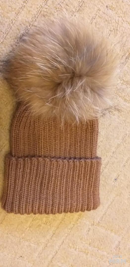 Шапка зима, на ОГ 48-52. Меринос экстрафайн, италия. Помпон енот
