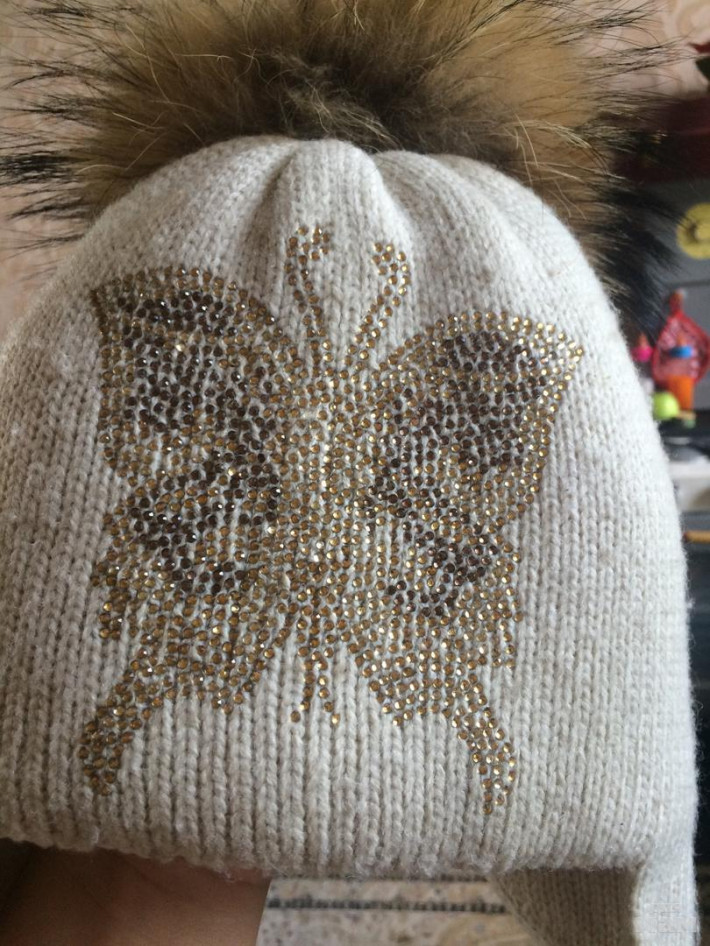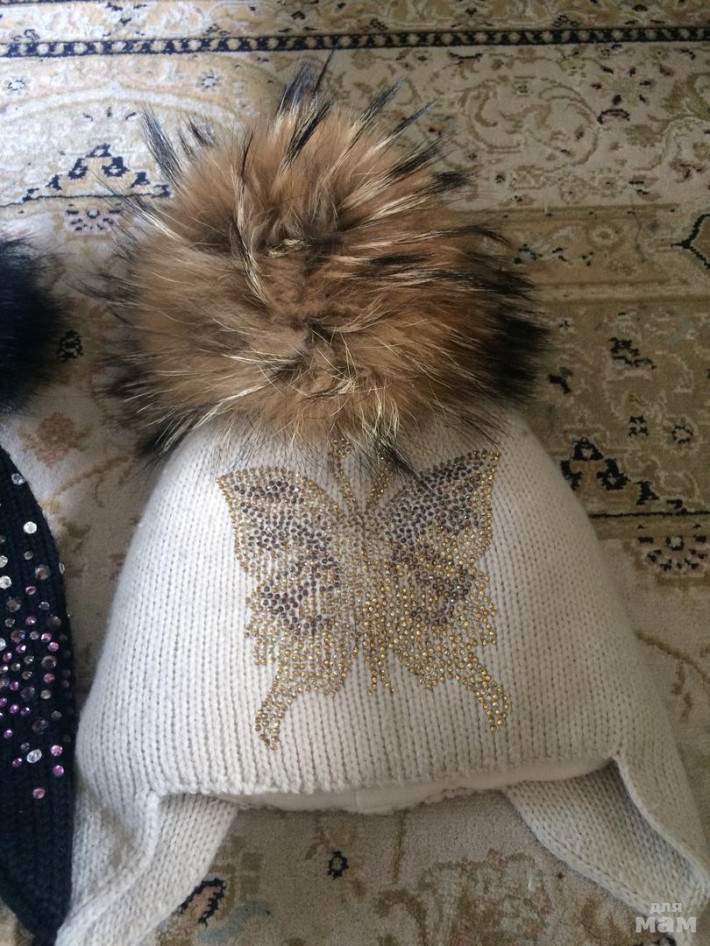 Очень красивая шапочка с огромным помпоном из енота!Большая бабочка в стразах