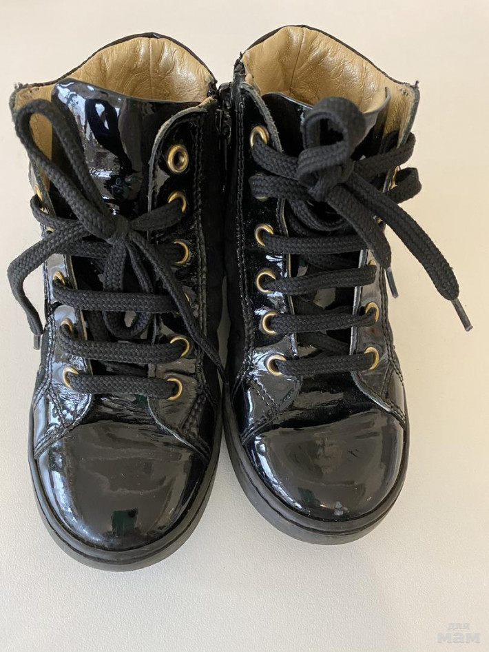 Ботиночки в хорошем состоянии, на левом носке маленький скол, незаметен. Носки лаковые, сами из чёрной замши, украшены стразиками. Выглядят нарядно.