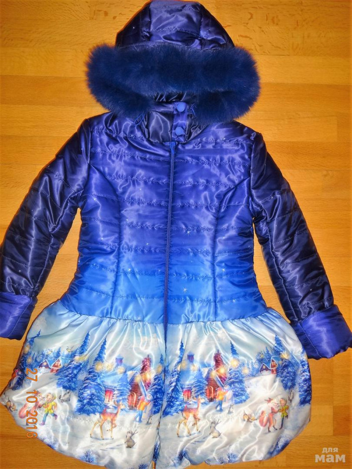 Куртка классная! Материал типа атласа,т. синий ,блестит.Рукав хорошо подворачивается,внутри материал основной ткани. Не на очень сильные морозы,но на 0 - 5 точно можно и на лыжах и коньках самое то! С белой шапкой и варежками будет просто Снегурочка! Нам на рост 132 очень хорошо! + подворот рукава до 8см.У нас перехап жуткий,иначе бы не отдала бы!