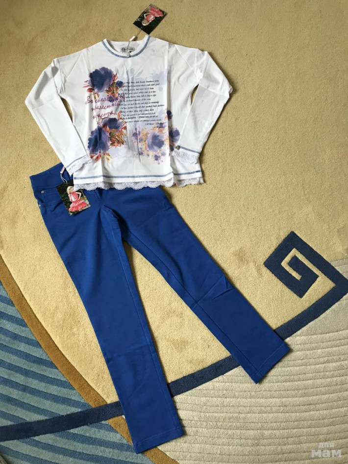 Шикарный трикотаж !!! Очень красивый новый комплект ( Блуза + брюки трикотажные ) на 146,в размер, на брюках есть утяжка, качество потрясающее, хлопок 95% с эластином 5%. Новый с бирками. В Реале как на каталожном фото яркого синего цвета василька. Товар выставленный в объявлении целиком и полностью соответствует каталожному фото.