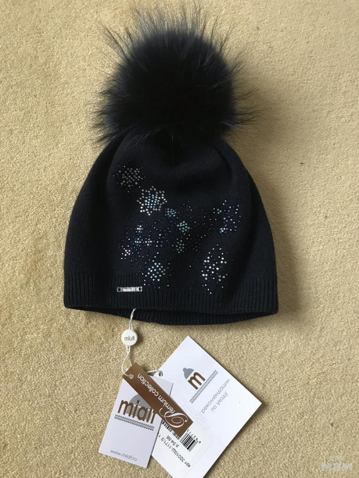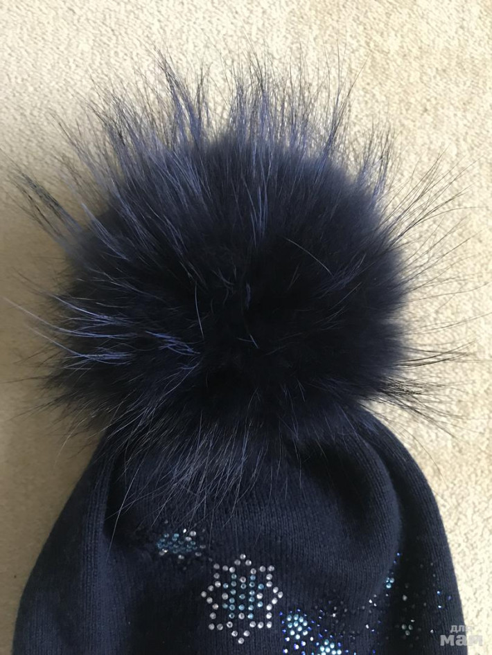 Шерстяная двойная шапочка с добавлением кашемировой и шелковой нити. Очень мягкая и приятная на ощупь. Декорирована звездочками из страз. Отстегивающийся помпон на кнопке из натурального меха енота. Размер 54-56