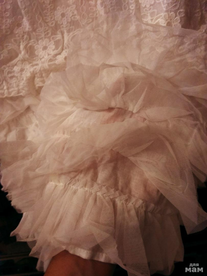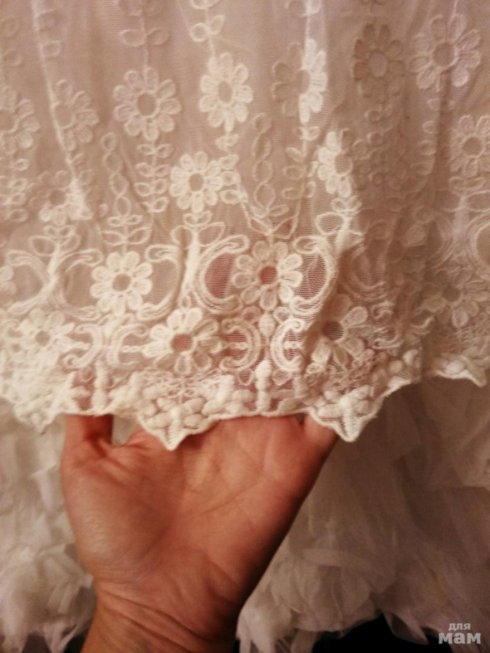 Нежное платье свободного кроя выполнено в ретро стиле. Внутри подкладка из хлопковой ткани. На спинке застежка-молния и тоненький ненавязчивый поясок, которым можно отрегулировать ширину платья. Юбка платья выполнена из каскада оборок. Верхняя часть в виде свободной блузки из тонкого ажурного кружева с цветочным орнаментом. Эта модель идеально подойдет как для жаркого летнего дня, так и для любого торжества.