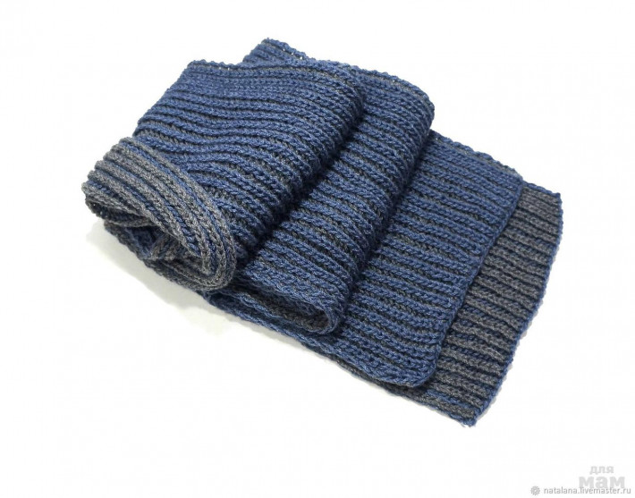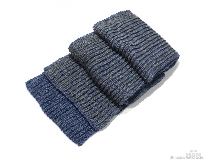Мужской шарф связан двухсторонним узором из пряжи двух цветов - джинсового и серого.