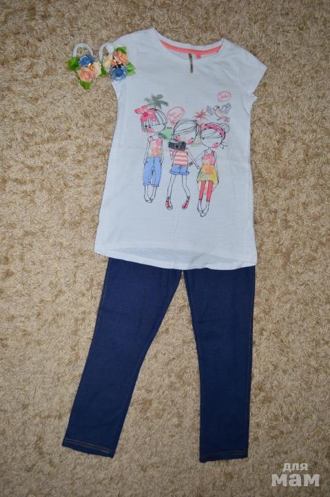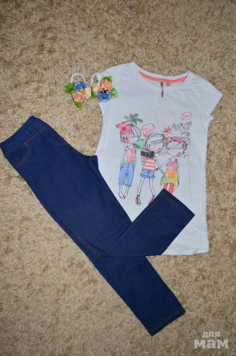 Продам комплектом: футболка некст с интересным принтом спереди и сзади, легги под джинсы- смотрятся отлично с любой футболочкой и пара резиночек ручной работы.