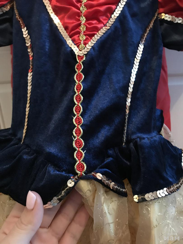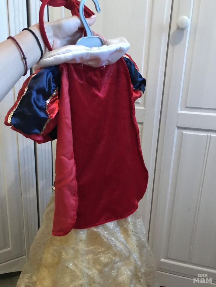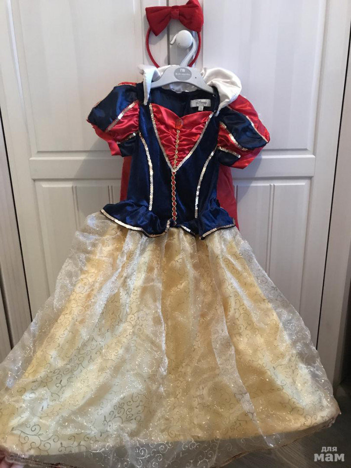 Платье от Disney ябелоснежка,куплено в оф.магазине за границей.Надевали 2 раза -на ёлку .Шлейф отстегивается-на липучках,низ на кольцак-можно вытащить( не додумалась).Ободок в комплекте,размер 110-116