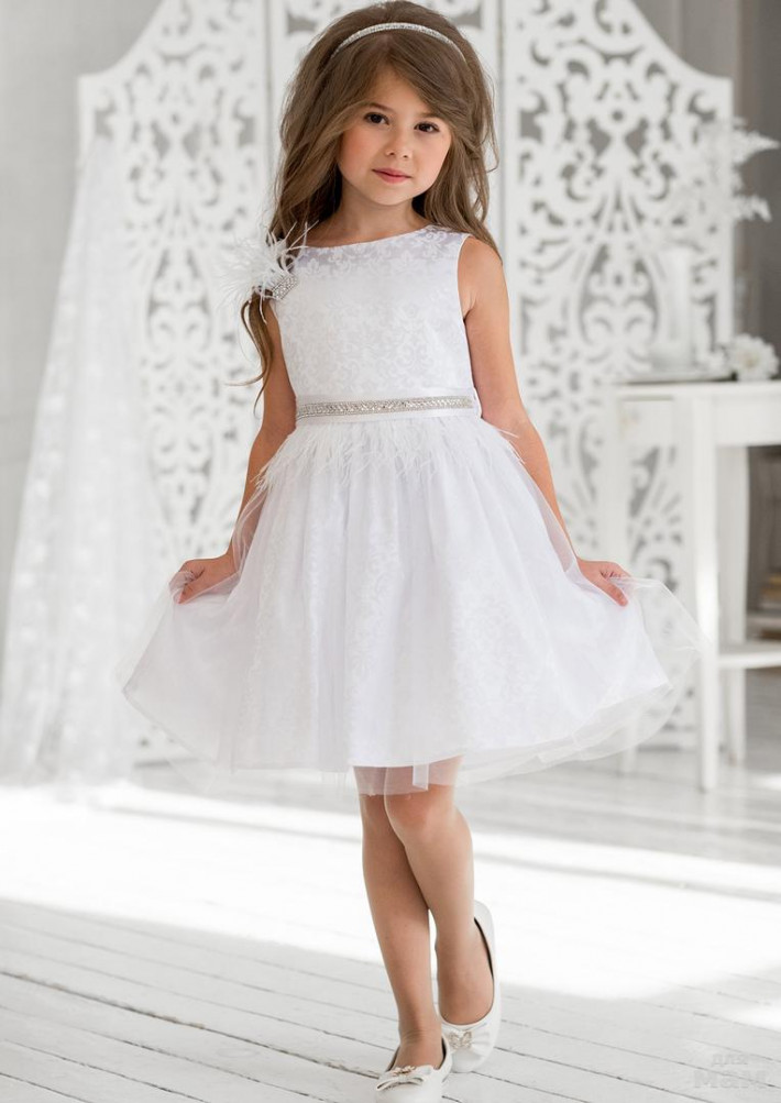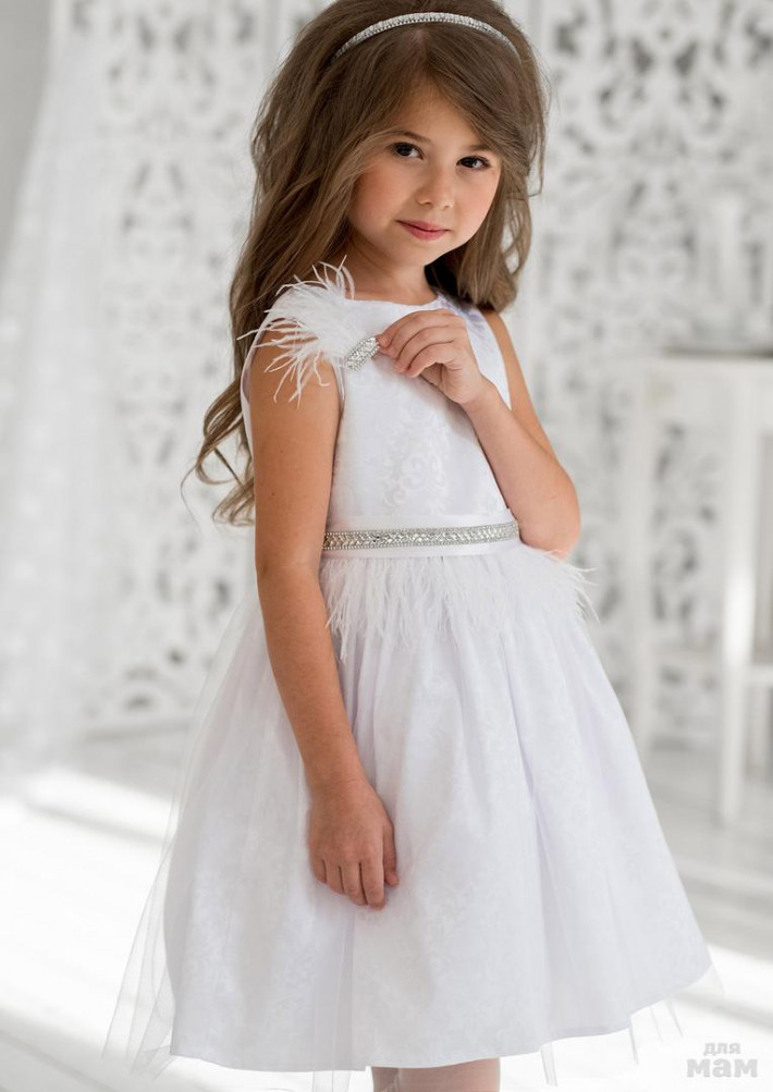 Праздничное платье классического кроя для маленьких принцесс. Лиф с круглым вырезом горловины и нижняя пышная юбка выполнены из ткани атлас-жаккард, с изысканым узором. Верхний слой юбки выполнен из сетки. Платье дополнено оригинальным атласным поясом-баской из воздушных перьев и очаровательной броши из таких же перьев, что придает ему изысканой элегантности.