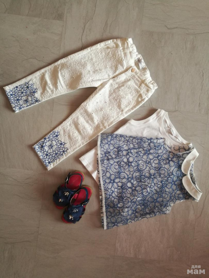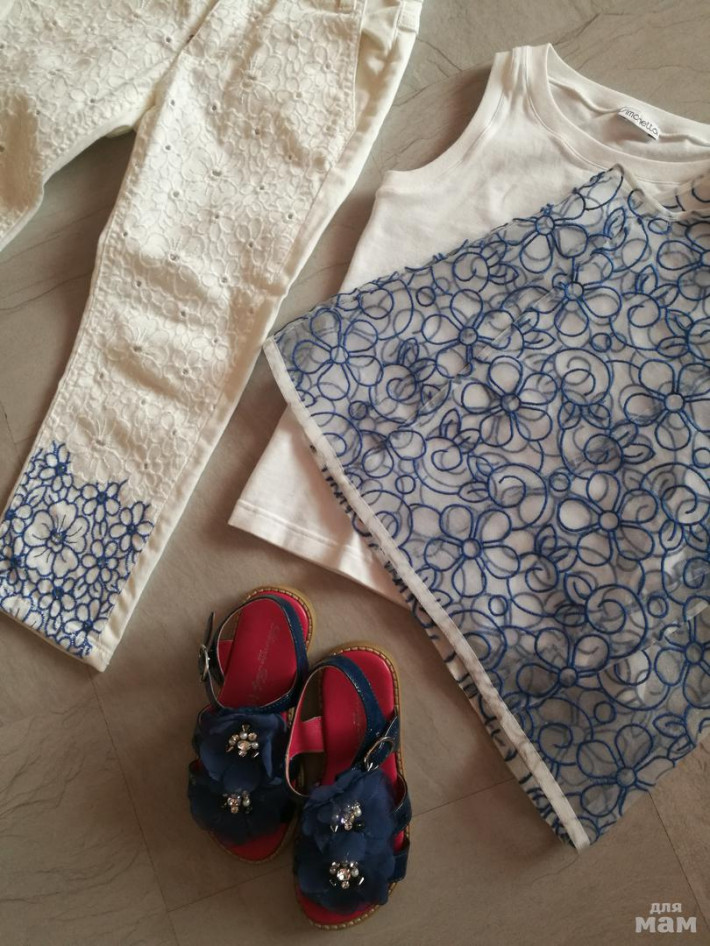 Всё в замечательном состоянии. Штанишки маркировка 6 лет, блузка с маечкой 5 лет. Босоножки 27 размер. Очень красивый комплектик от Simonetta.
