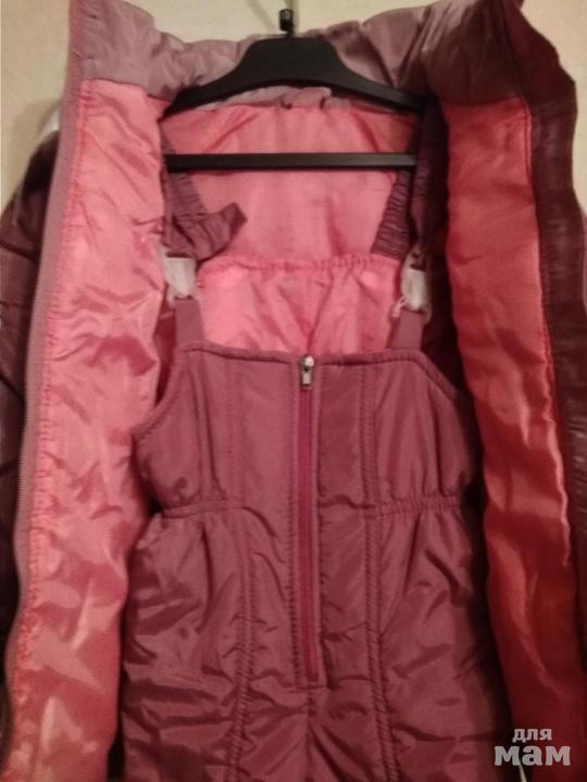 Очень симпатичный новый комплект, костюм для девочки! Нежно-ягодного цвета, "с отливом"! ) Пр-во России. По этикетке зимний, но не на сильные морозы. Утеплитель синтепон 350. Кармашки на молнии, в рукавах трикотажные манжеты. Лямки на п/к на резиночке, регулируются. Маркировка 122, но мне кажется на побольше. Длина куртки по спинке 60 см., рукав от плеча полностью, без отворота 51 см, от шеи 62 см. Штаны: длина от пояса 81 см.