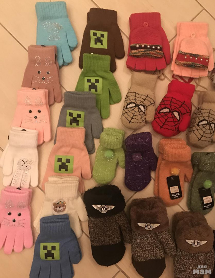 Отлично! Возьму две пары майнкрафта - синие (нижние) и зеленые. Перчатки для девочки их левого ряда - розовые (самые нижние) и давайте возьму 1 пару варежек с Китти - серенькие посветлее.