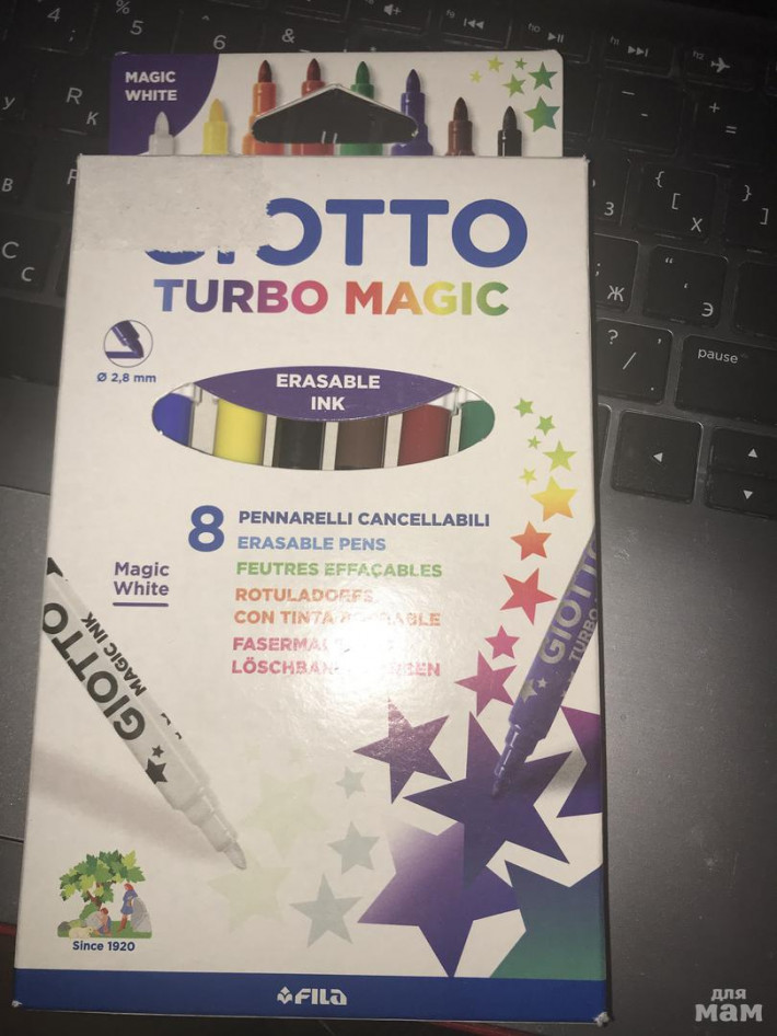 7 фломастеров + 1 волшебный (стирает написанное) . Цена 400 р