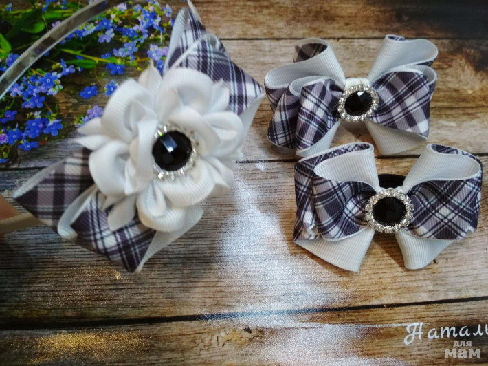 Комплект для школы - ободок и бантики из репсовой ленты , ювелирная серединка .