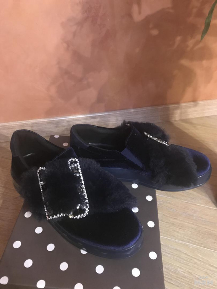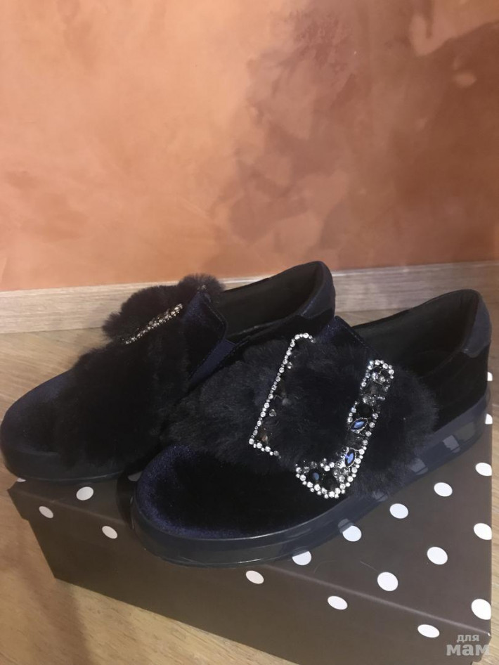 Размер 37. Одеты один раз до Машины - мне малы в подъёме. На очень высокий подъем не подойдут. Цвет темно- синийКожа, сверху бархат. Шикарная брошь на каждом. МЕГА удобные.