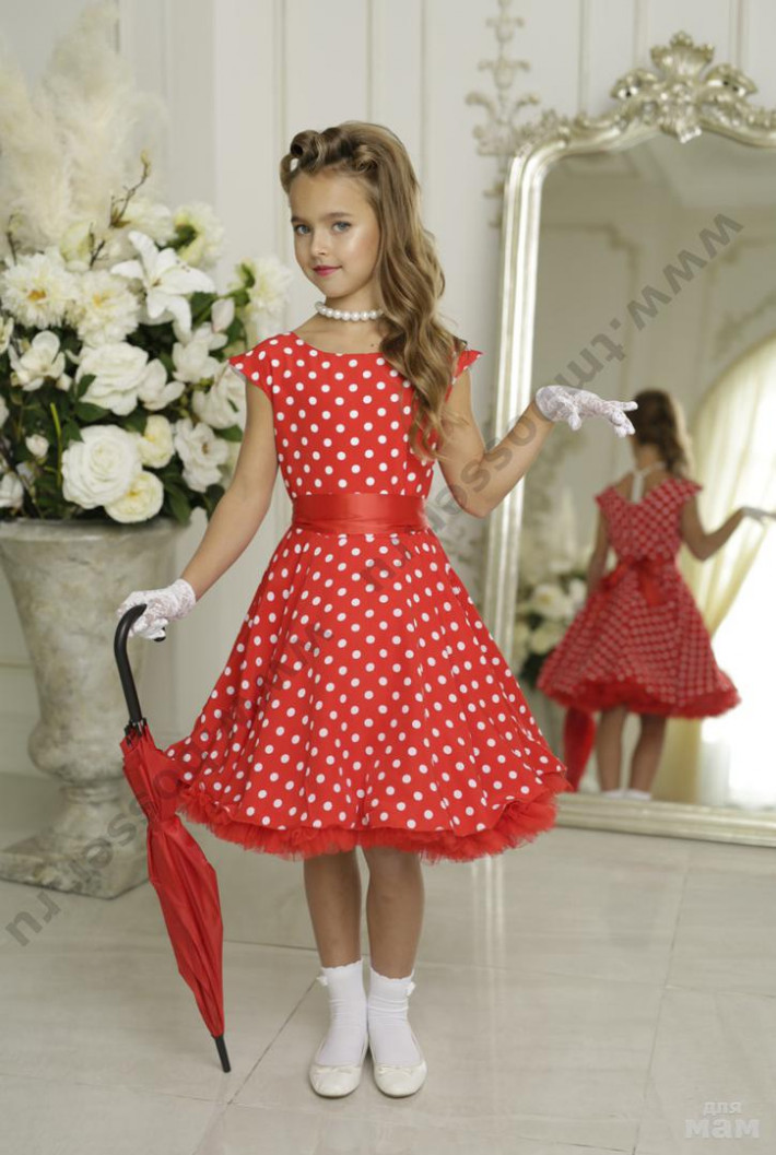 Платье комбинированное. Лиф из ажурного полотна на атласе. Юбка из ткани в горошек с суперпышным многослойным подъюбником. Пояс-вставка с съемным цветком.. На спинке застежка молния. Наряды в стиле стиляг легко узнаваемы по оригинальным фасонам и яркой расцветке. Сегодня такая одежда популярна и в детской моде. Девочке можно приобрести платье в стиле стиляг для утренника, похода в гости или для торжественного события. Это прекрасный вариант наряда на выпускной, проводимый в детском саду или по окончании начальной школы