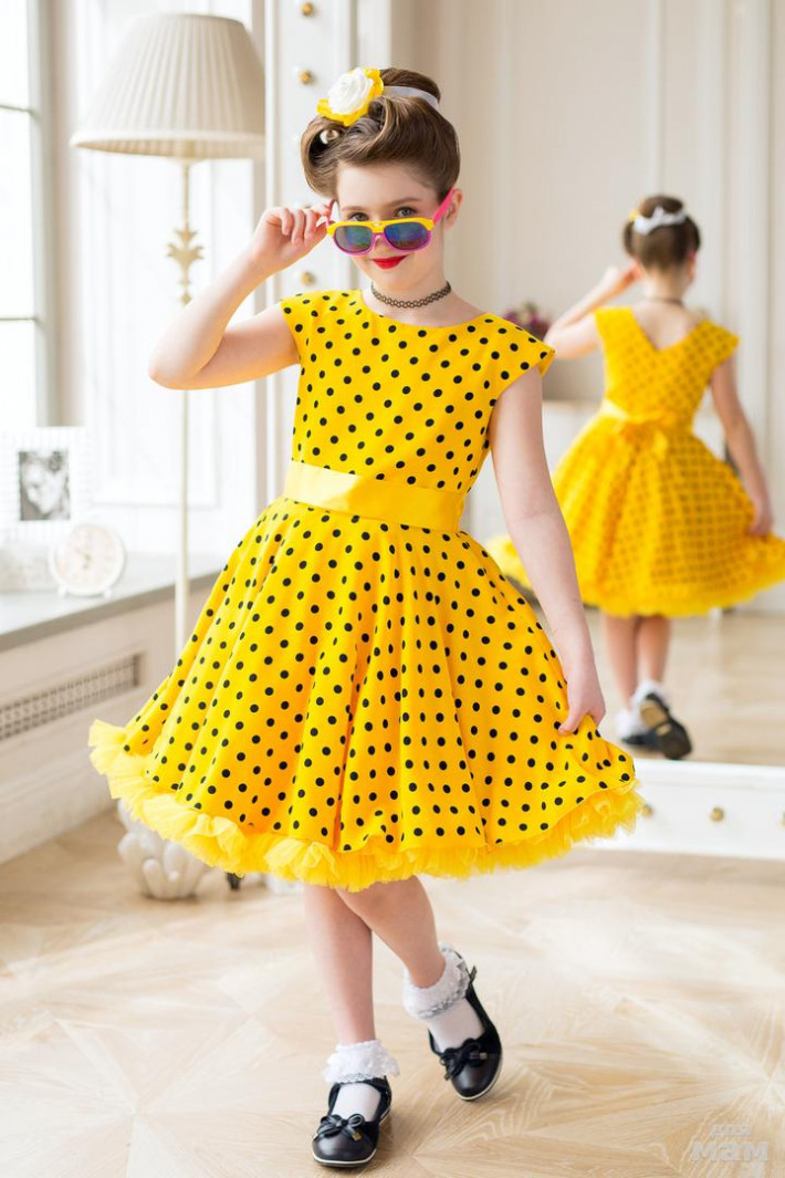 Платье комбинированное. Лиф из ажурного полотна на атласе. Юбка из ткани в горошек с суперпышным многослойным подъюбником. Пояс-вставка с съемным цветком.. На спинке застежка молния. Наряды в стиле стиляг легко узнаваемы по оригинальным фасонам и яркой расцветке. Сегодня такая одежда популярна и в детской моде. Девочке можно приобрести платье в стиле стиляг для утренника, похода в гости или для торжественного события. Это прекрасный вариант наряда на выпускной, проводимый в детском саду или по окончании начальной школы.