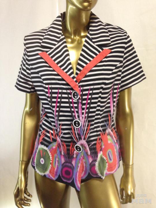 Пиджак с цветным рисунком и коротким рукавом, 30% полиэстер, 70% вискоза, с плечиками, материал тянется, мало б.у, в отличном состоянии (требует глажки), размер 42, обхват груди 104, длина 59,5 см,без торга строго 300 руб. Цвет немного будет отличаться но не сильно! Учитывайте студийное освещение! Цена уже указана со скидкой!