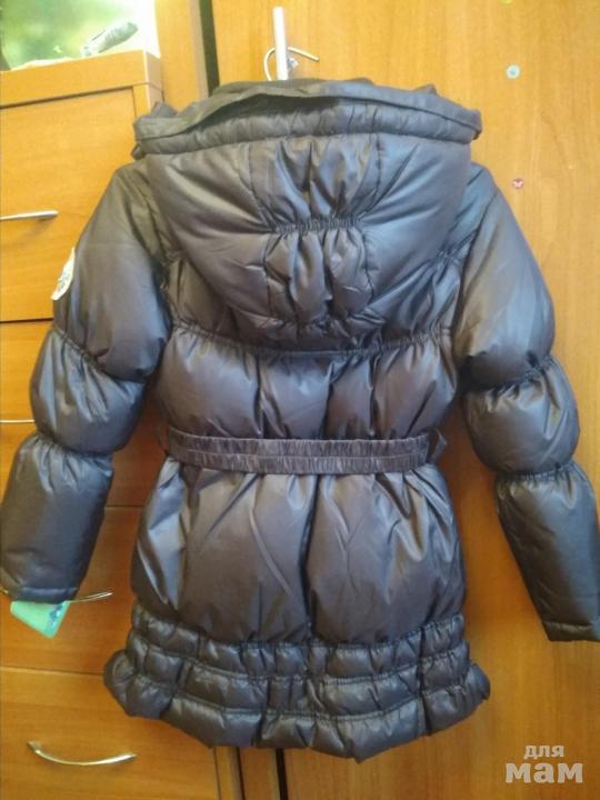 Абсолютно новое красивое пальто. Германия. Цвет тёмный шоколад. 80% пух, 20% перо. На рост 116, но на самом деле можно до 130! На стройную девочку. Капюшон снимается, на молнии; застегивается на липучки, есть утяжки. В рукавах трикотажные манжеты, как на шее. Длина 64 см, рукав от плеча 45, от шеи 54.