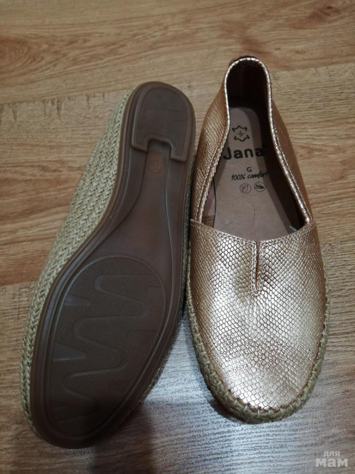 Новые стильные эспадрильи JANA, натуральная кожа, размер 39 (стелька 25,5 см.), страна производства: Португалия, привезены из Германии. Цвет: металлик, стелька съемная.Мягкая и удобная обувь для лета, комфортная пятка. Обувь составит отличное дополнение к любому летнему гардеробу.