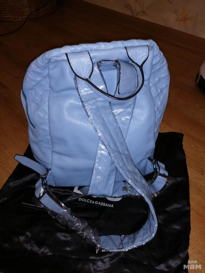 Стильный рюкзак от мирового бренда Dolce & GABBANA. Оригнальная фурнитура. Полноценные широкие лямки. Подойдёт для школы, поездок, посещения спортзала. В комплекте: пылезщитный мешок Dolce&Gabbana. Рюкзак с различными отделениями на молнии, внутри-одно отделение+карманы, боковой карман на молнии, кармашки для мелочей. Натуральная кожа. Цвет: небесно-голубой