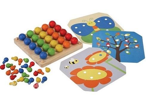 Игра включает деревянных гвоздики двух размеров (по 5 штук каждого цвета и размера), деревянную доску и 3 карты-шаблона. Игра с красочными деревянными гвоздиками стимулирует развитие мелкой моторики, координации рука-глаза, зрения, понимания положения в пространстве и формирует понятие сочетаемости.