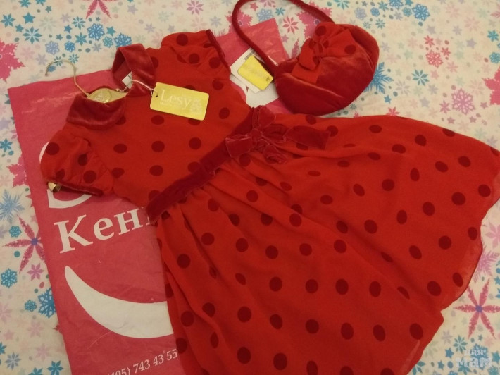 Новое нам огромное .маркировка 5 лет .очень красивое ,ярко красное .на бархатных горошках кое где как точки светлые .так и было изначально.Понятно,что на ребенке не видно будет .почта сдек.цена окончательная.надо срочно купить на утренник новое ,это просто огромное нам
