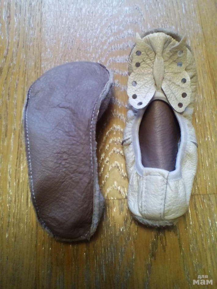 Шикарные Кожаные чешки с бабочками 18 см. Шились на заказ. Чешки белый перламутр, бабочки в цвет. Сидят элегантно. Можно носить с длинной стопы в 17 см. Идут на размер 27-28. Состояние отличное.